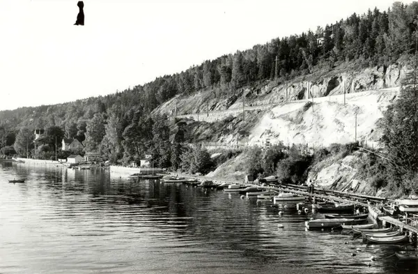 Nedre Bekkelaget med Mosseveien i Oslo. Småbåthavna eller baåtplassen ble kalt Sandkroken. Motivet er fotografert fra Ulvøybrua i 1936. Vei og jernbane ses i åsen ovenfor.