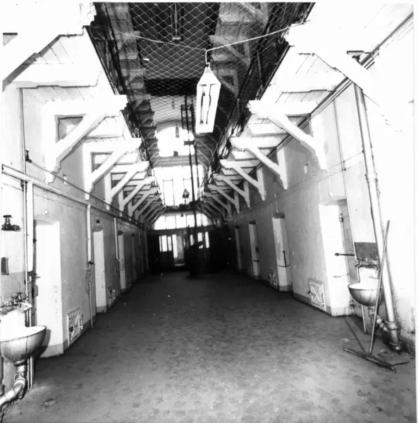 Oslo kretsfengsel, Møllergata 19, fotografert 1975, oppført 1866. Korridor i 2. etasje.