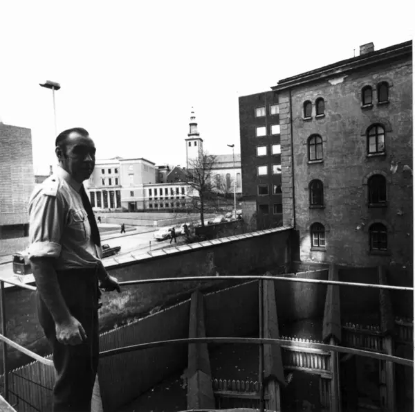 Utsikt over luftegårdene i Oslo kretsfengsel, Møllergata 19, fotografert 1975, oppført 1866. Mot Grubbegata.