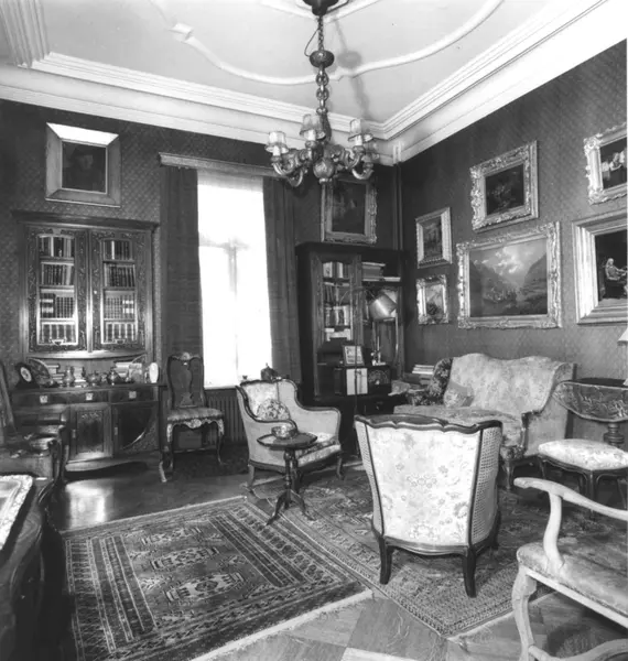 Inkognito terrasse 9, Oslo 1977. Stue med salong, malerier og bokskap.