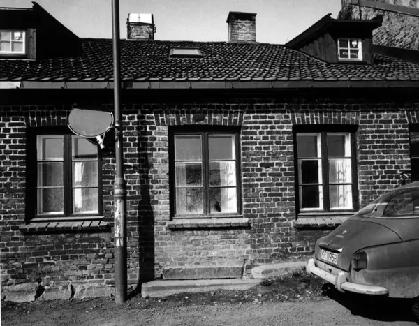 Sagveien 10, Oslo 1983. Lavt mursteinshus sett fra gata.