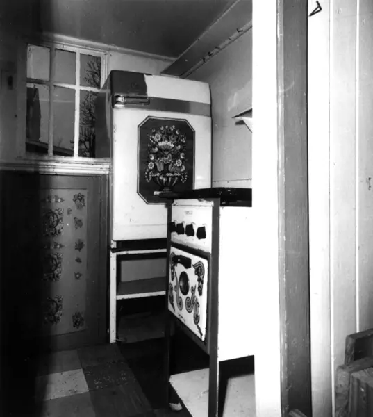 Etterstad Kolonihage, Oslo 1981. Kolonihagehus, kjøkken med komfyr og kjøleskap.
