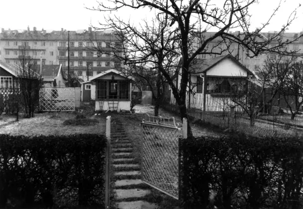 Etterstad Kolonihage, Oslo 1981. Kolonihagehus bak hekk med port.
