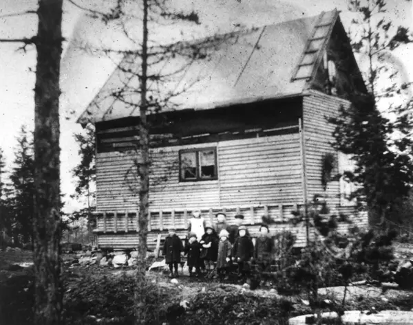 Bolighus, ant. Oslo. Barnegruppe poserer foran langvegg. Fra boliginspektør Nanna Brochs boligundersøkelser i Oslo 1920-årene.