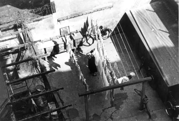 Gårdsrom, bygårder, Oslo. Oversiktsbilde med klessnorer, sykler og søppelkasser. Fra boliginspektør Nanna Brochs boligundersøkelser i Oslo 1920-årene.
