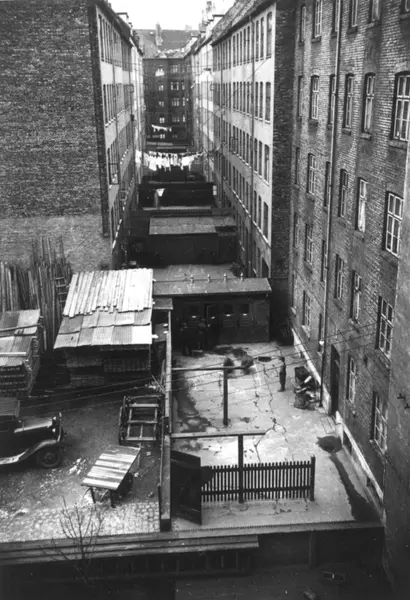 Gårdsrom, bygårder, Oslo. Oversiktsbilde som viser flere atskilte gårdsrom innover, noen med klesvask. Fra boliginspektør Nanna Brochs boligundersøkelser i Oslo 1920-årene.
