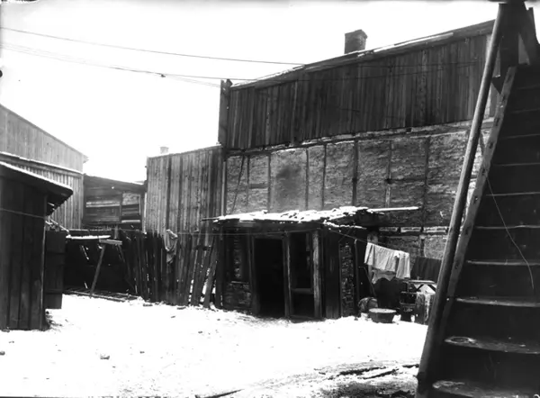 Gårdsrom med uthus, ant. Rodeløkka, Oslo. Klesvask på snor. Fra boliginspektør Nanna Brochs boligundersøkelser i Oslo 1920-årene.