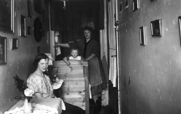 Interiør, bebodd gang, møblert med møbler og seng. Fra Det Rivertzske kompleks, Sagene. Mor med barn poserer. Fra boliginspektør Nanna Brochs boligundersøkelser i Oslo 1920-årene.