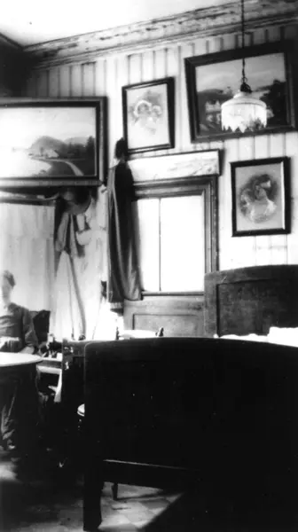 Interiør, tett møblert med seng, bord og stoler (gang innenfor ytterdør?), Oslo. Fra boliginspektør Nanna Brochs boligundersøkelser i Oslo 1920-årene.