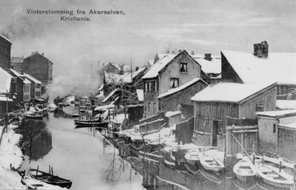 Akerselva, Oslo. Vinterbilde med hus og båter langs elva.