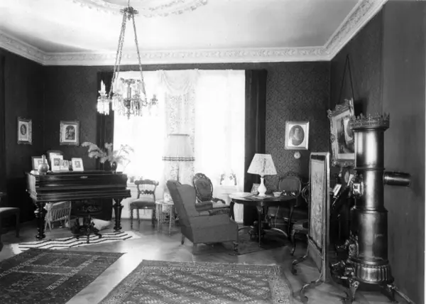 Middelthuns gate 2, Oslo 1957. Interiør i enkefru Marie Weidemanns leilighet. Stue med flygel.