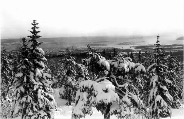 Utsikt fra Tryvannshøgda, Oslo 1936. Vinterbilde med snøtunge trær. I bakgrunnen ses Oslo sentrum og den indre delen av Oslofjorden.