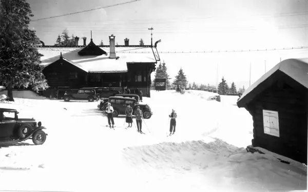 Skiløpere ved Frognerseteren, Oslo. 1934. Utenfor restauranten står det parkerte biler.