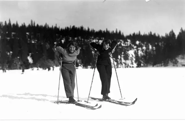 Slalåmrenn, Tryvannsåsen, Oslo. 1934. To kvinnelige skiløpere tar en hvilepause på Tryvann.