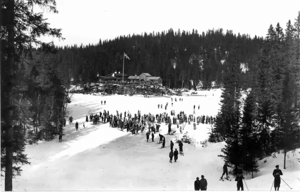 Slalåmrenn, Tryvannsåsen, Oslo. 1934. Her ses nederste del av løypa med publikum. I bakgrunnen Tryvannstua med flagget til topps.
