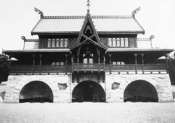 St. Hanshaugen, Oslo, eksteriør av restaurantanlegget Hasselbakken. Bygget 1890, tegnet av ark. Holm Munthe i dragestil. Grotter ble anlagt i fjellet under restauranten. Brente 1936. Del av Brødrene Brunskows serie norske landskapsbilder.