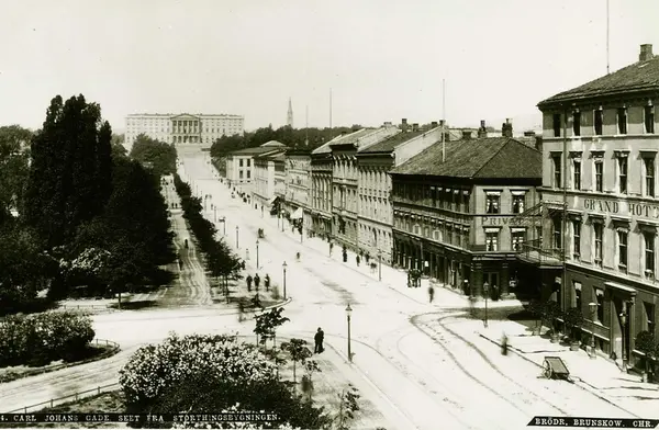 Karl Johans gate, Oslo sett fra Stortinget opp mot Slottet. Grand Hotel t.h., t.v. for dette Privat Hotel. Del av Brødrene Brunskows serie norske landskapsbilder.
