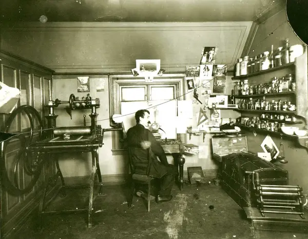Portrett av mann i verksted/atelierinteriør, ant. fotograf August Brunskow (1862-1906), den eldste av de to Brødrene Brunskow, som drev firma med fotografi og kjemigrafi. Brunskow sitter delvis med ryggen til foran et bord i et rom med 2 maskiner (presser?), hyller med kjemikalieflasker, en stor kiste og div. bilder tilfeldig opphengt på veggen. På gulvet t.h. for ham står en utkopieringsramme for direktekopiering av fotografier.