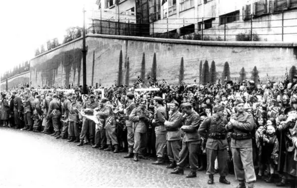 Fra Oslo 7. juni 1945 - Kongen kommer tilbake. Publikum, med flagg og soldater med gevær, venter spent langs kjøreruten. Antatt ved restaurant Skansen.