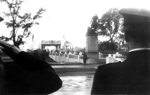 Fra Oslo 7. juni 1945. Kongen kommer tilbake.Utsikt mot Honnørbryggen og æresportalen. Publikum venter mens soldater holder vakt. To politimenn med ryggen til forrest i bildet.