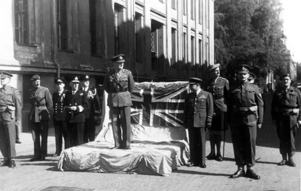 Fra fredsdagene i 1945.Uniformerte menn ved og på et platå, med det britiske flagg i bakgrunnen.Platået er plassert i krysset ved Universitetsgata og Karl Johans gate.