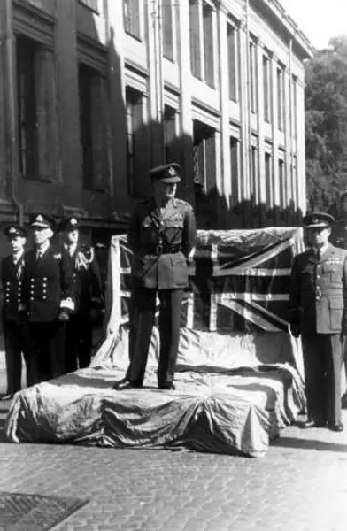 Fra fredsdagene i 1945.Uniformerte menn ved og på et platå, med det britiske flagg i bakgrunnen.Platået er plassert i krysset ved Universitetsgata og Karl Johans gate.