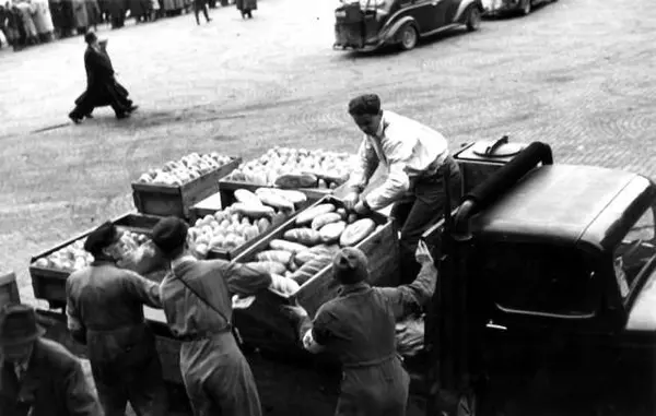 Fra fredsdagene i 1945.En lastebil kommer med et lass brød. fire menn tømmer bilen for varer, antagelig fra Danskehjelpen.