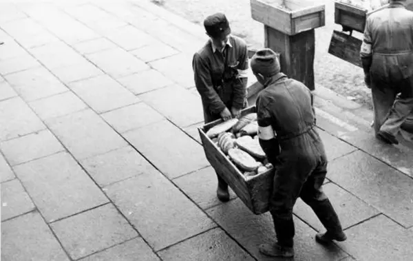 Fra fredsdagene i 1945. En lastebil har nettopp kommet med en brødleveranse. Bilen blir tømt, og her bærer to menn en kasse med brød mellom seg. Antagelig varer fra Danskehjelpen.
