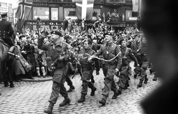 Fra fredsdagene i 1945.Kaptein Frøili og hans fallskjermtropper marsjerer nedover Karl Johans gate med blomster og friske grenser i armene..Her utenfor Tostrupgården.