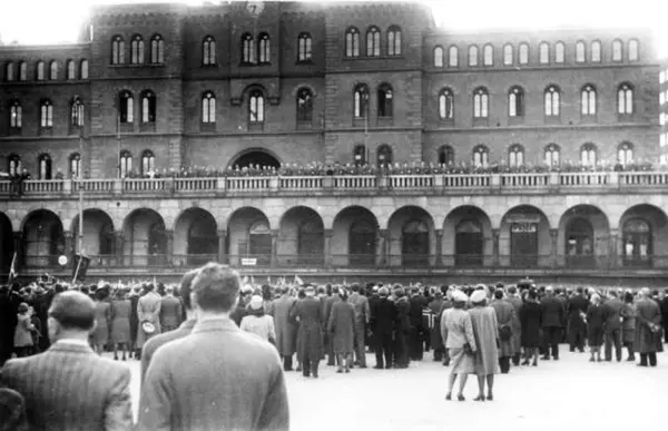 Fra Oslo under fredsdagene i 1945. Youngstorget mot Basarhallene og Møllergata 19.