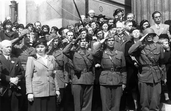 Fra Oslo under fredssdagene i 1945. Publikum og soldater på trappen foran hovedinngangen til Universitetet i Oslo.
