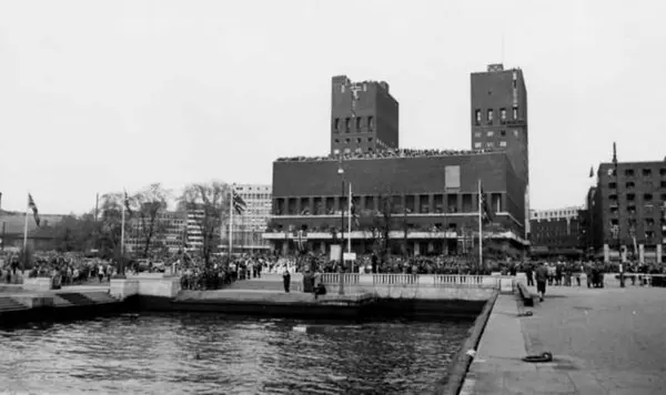 Fra Oslo under fredsdagene i 1945. Antagelig 13.mai ved Kronprins Olavs hjemkomst. Her fra Honnørbrygga mot Rådhuset.