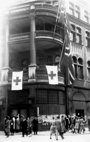 Fra Oslo under fredsdagene i 1945.Hotell Continental med Theatercafeen pyntet med norske flagg og røde kors sine flagg.
