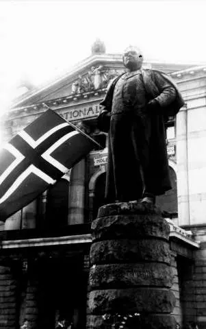 Fra Oslo under fredsdagene i 1945. Statue av Bjørnstjerne Bjørnson på sokkel utenfor Nationaltheatret.