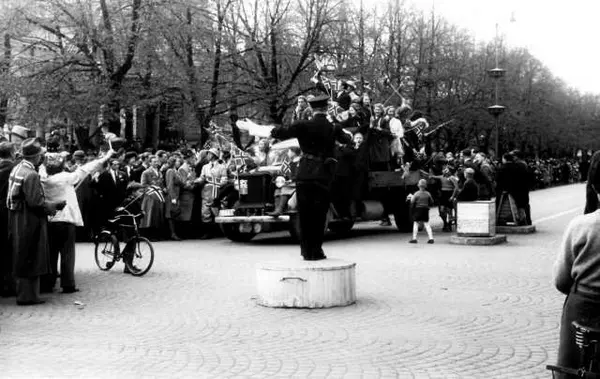 Fra Oslo under fredsdagene i 1945. Politimann dirigerer trafikken i krysset mellom Karl Johans gate og Universitetsgata, med jublende mennesker i bakgrunnen. En lastebil, med feirende ungdommer, kommer kjørende nedover Karl Johans gate og har akkurat nådd krysset.I bakgrunnen til venste skimtes Musikkpaviljongen