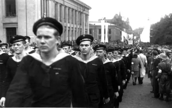 Fra Oslo under fredsdagene i 1945.Marinen marsjerer opp Karl Johans gate.Universitetet i bakgrunnen.