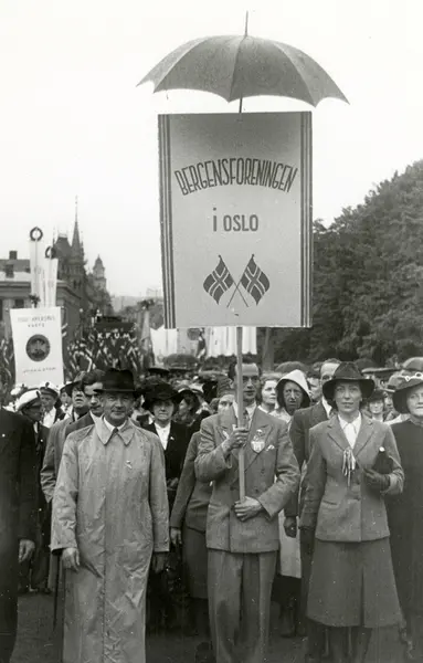 Fra Oslo under fredsdagene i 1945. Bergensforeningen i Oslo marsjerer oppover Karl Johans gate med plakat beskyttet av paraply.