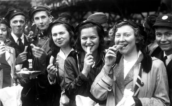 Fra Oslo under fredsdagene i 1945. Fra Tullinløkka hvor Danskehjelpen hadde boder.Flere unge mennesker med studenterluer koseer seg med maten.