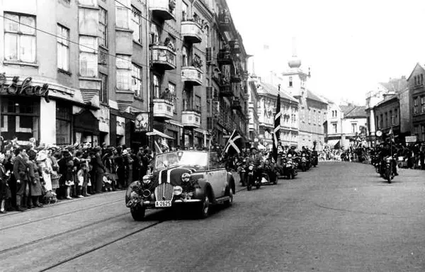 Fra Oslo under fredsdagene i 1945. Idrettens Dag på Bislett Stadion 3. juni. Biler og publikum i Ullevålsveien.