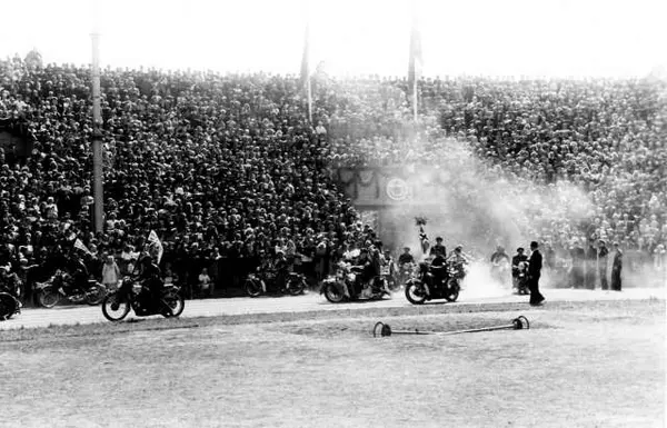 Fra Oslo under fredsdagene i 1945. Idrettens Dag på Bislett Stadion 3.juni .Motorsykler kjører inn porten og bortover den oppmerkede banen.