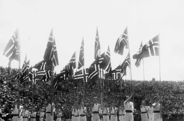 Fra Oslo under fredsdagene i 1945. Idrettens Dag på Bislett Stadion 3.juni.Idrettsmenn med flaggborg på den oppmerkede banen.