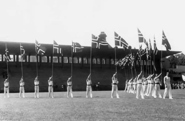 Fra Oslo under fredsdagene i 1945. Idrettens Dag på Bislett Stadion 3.juni. Idrettsmenn med flaggborg på den oppmerkede banen.