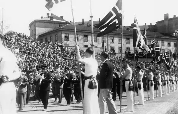 Fra Oslo under fredsdagene i 1945. Idrettens Dag på Bislett Stadion 3.juni.Idrettsmenn med flaggborg og et musikkorps marsjernede på den oppmerkede banen.