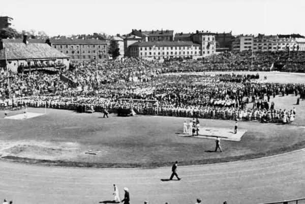 Fra Oslo under fredsdagene i 1945. Idrettens Dag på Bislett Stadion 3.juni. Oversiktsbilde viser hele banen med deltakere og publikum