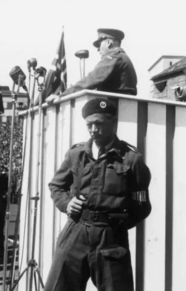 Kronprins Olav holder tale i Oslo under fredsdagene i 1945. Idrettens Dag på Bislett Stadion 3.juni.