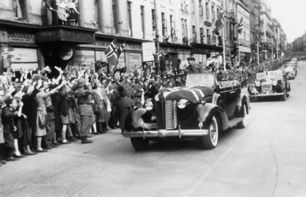 Fra Oslo under fredsdagene i 1945. Den 13.mai kommer Kronprins Olav tilbake.Kortesjen kjører oppover Karl Johans gate i retning Slottet.Kronprinsen sitter på kalesjen og hilser til de fremmøtte.