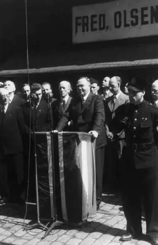 Fra Oslo under fredsdagene i 1945. Skipet Andes anløper Oslo Havn den 31.mai, med ca. 700 eksilnordmenn fra regjering og administrasjon.. Statsminister Johan Nygaardsvold på talerstolen. I bakgrunnen ser vi ordfører Einar Gerhardsen, som har holdt velkomsttalen.