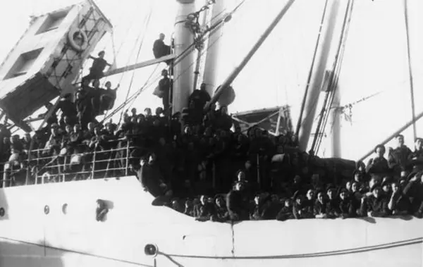 Fra Oslo under fredsdagene i 1945. Skipet Andes anløper Oslo Havn den 31.mai, med ca. 700 eksilnordmenn fra regjering og administrasjon..Her er noen av passasjerene samlet på dekk.