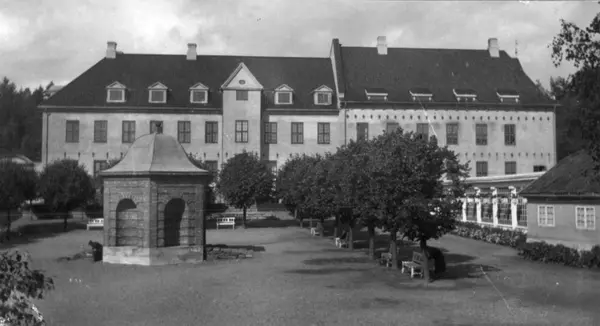 Fra Torget mot Bybygningen og brønnhuset , bygning nr. 311, og 312 i 1929.