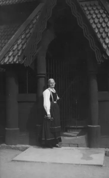 Ansatte, forøvrig museets eldste person i 1929, Asgjerd Haugen utenfor Stavkirken, bygning nr.181 på Norsk Folkemuseum.